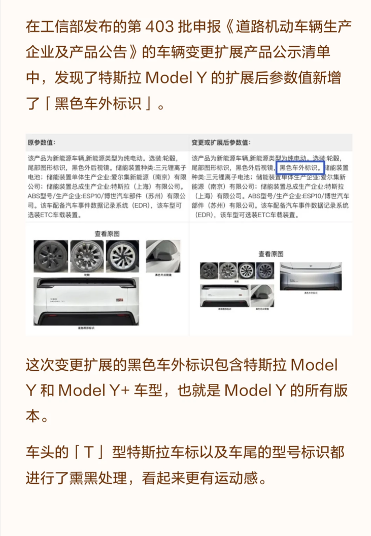 新能源市场的“卷王”特斯拉又有新动作!工信部最新申报信息显示,Model Y系列新增“黑色车外标识”变更扩展,车头“T”型车标与车尾型号标识均进行熏黑处理,Model Y黑标版正式提上日程。与此同时,特斯拉同步升级金融方案,首付比例下限降至17%牛点策略,搭配此前的7年超低息政策,既靠颜值加分,又拉低购车门槛,势要在中型纯电SUV市场继续领跑。